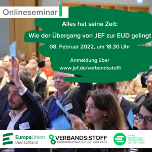 Wie der Übergang von der JEF zur Europa-Union gelingt, ist eine wichtige Frage der Mitgliederbindung. Gerade nach zwei Jahren Pandemie, die die Mitgliederentwicklung negativ beeinflusst hat, ist es wichtig, diese Gruppe in den Blick zu nehmen. Am Dienstag, den 8. Februar 2022, führen EUD und JEF von 18.30 bis 19.45 Uhr zu diesem Thema eine online Akademie durch.