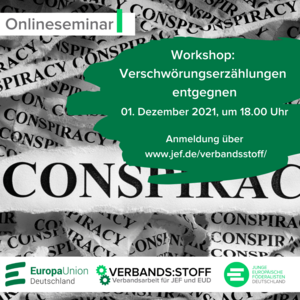 Verschwörungserzählungen haben in Zeiten von Corona Konjunktur. Auffällig ist, dass Verschwörungserzählungen fast immer antisemitische Vorurteile enthalten. Bei der digitale Ausgabe der JEF-EUD-Akademie am 1. Dezember 2021 um 18 Uhr werden wir antisemitische Denkstrukturen in Verschwörungserzählungen und -ideologien thematisieren sowie Handlungsoptionen für den Alltag aufzeigen und diskutieren.