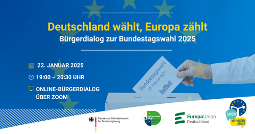 "Deutschland wählt, Europa zählt! Bürgerdialog zur Bundestagswahl 2025" am Mittwoch, 22. Januar 2025 von 19 Uhr bis 20:30 Uhr über Zoom.