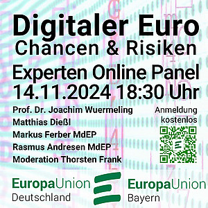 Am 14. November um 18:30 Uhr laden Europa-Union Bayern und Europa-Union Deutschland zu einer Online-Veranstaltung zum Digitalen Euro ein. Panel-Gäste sind Rasmus Andresen MdEP, Matthias Dießl, Präsident des Sparkassenverbandes Bayern, Markus Ferber MdEP und Prof. Dr. Joachim Wuermeling, ehem. Vorstandsmitglied der Deutschen Bundesbank.
